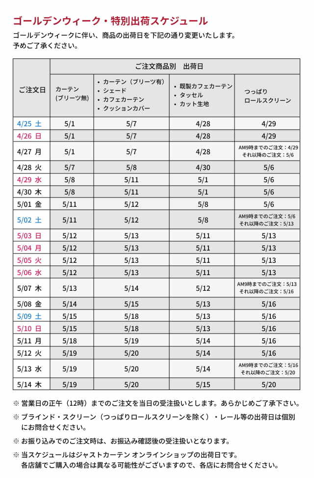 専売店・スマートオーダーの営業状況は各店舗へお問合せ下さい。ジャストカーテン店舗一覧は こちら【オンラインショップ】GW・特別出荷スケジュール