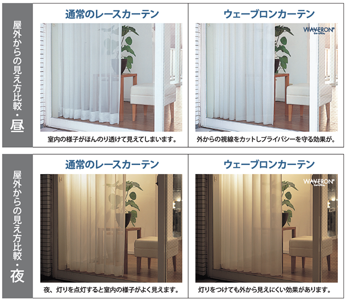 夜間でも室内の照明をつけても外から見えにくいため、一日中プライバシーを確保したい場合には遮像カーテン(遮像レースカーテン)が適しています。