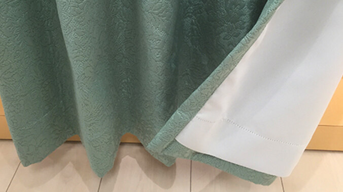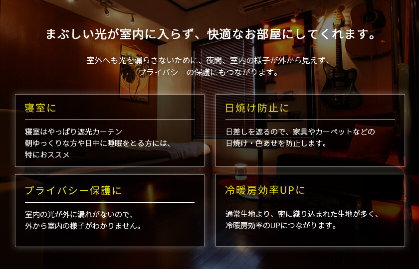 裏面に樹脂加工、あるいは、間に遮光フィルムを挟み込む加工を施すことで、徹底的に遮光にこだわったカーテンです。