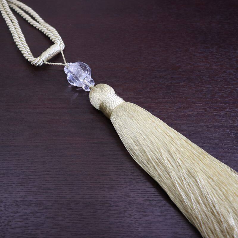 アクリルのクリアボールをアクセントにフリンジが長めに仕上げられているのが特徴です。落ち着いたラメ感が端正なタッセルです。