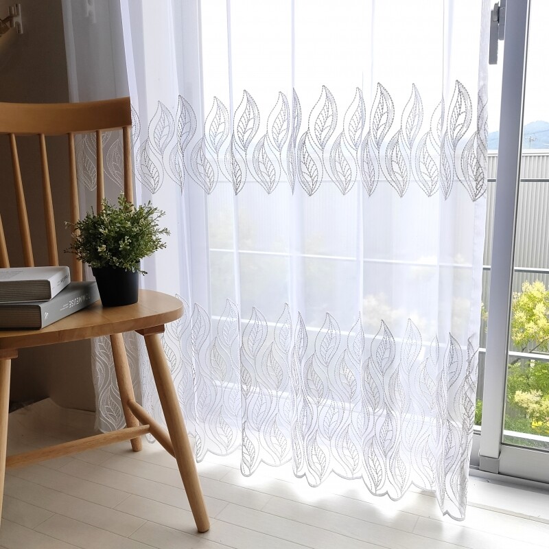ボイル地の裾部分に、糸はホワイトとベージュのバイカラー使いで優雅な葉モチーフを刺繍した、裾スカラップ(絵羽)レースです。曲線に沿って規則的に配置された葉が、モダンな印象を与えます。初の”防炎刺繍レース”シリーズなので、機能性も◎家庭洗濯OK(ウォッシャブル)なので、お手入れも簡単です。カラー:やさしいホワイト色