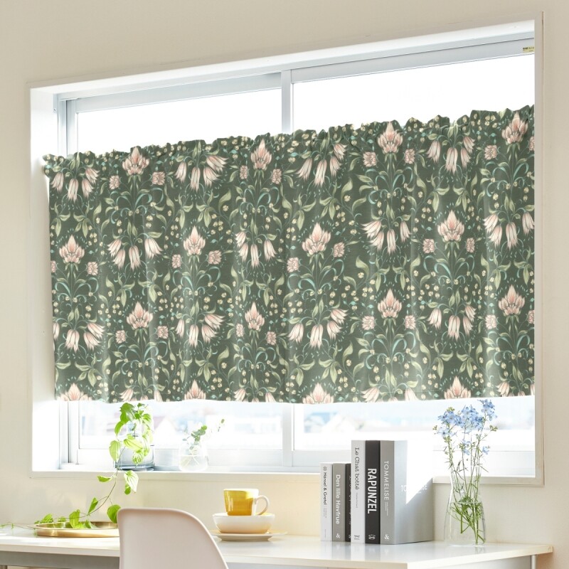 モリス調のクラシックで高級感のある植物柄が美しい、遮光1級のプリントドレープです。モスグリーンを基調とした重厚感のある色合いが、大人っぽいエレガントな空間を演出し、まるで優雅な音楽が流れてくるかのようです。また、サテン織の生地はクリーンな表面感で手触りが良く、品のある素材感も魅力のおすすめのアイテムです。家庭洗濯OK(ウォッシャブル)なので、お手入れも簡単です。