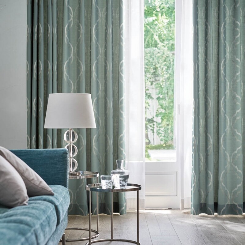 ライン表現で描かれたモダンなダマスク紋様を、ジャカード織で仕上げました。ウォッシャブルなのでお手入れも簡単。カラー:スモーキーなブルー色