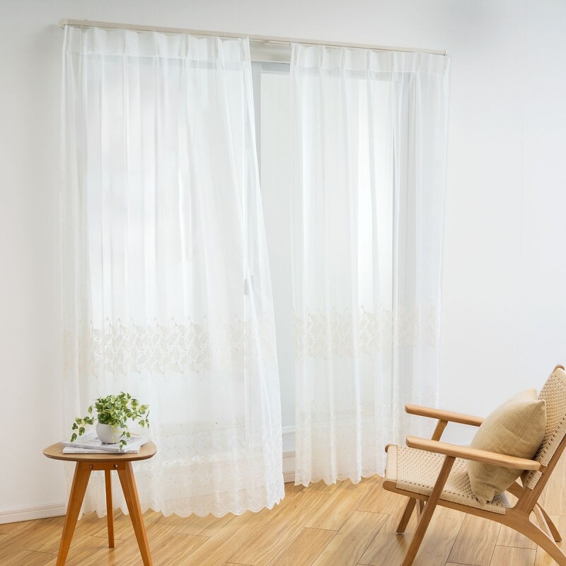 ナチュラルな風合いのスパンボイルのベース生地に、ボーダー調にカジュアルなリーフ柄を刺繍した、裾スカラップレースです。ナチュラルモダンテイストのインテリアにおすすめ。家庭洗濯OK(ウォッシャブル)なので、お手入れも簡単。カラー:ナチュラルなホワイト色。刺繍は裾から約82.5㎝まで。