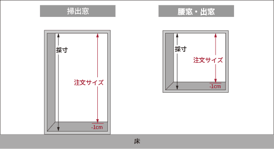窓枠内より床(腰窓の場合は窓枠の下部、出窓の場合は窓台)までの長さ から-1cm短くお仕立てするとスッキリ収まります。
