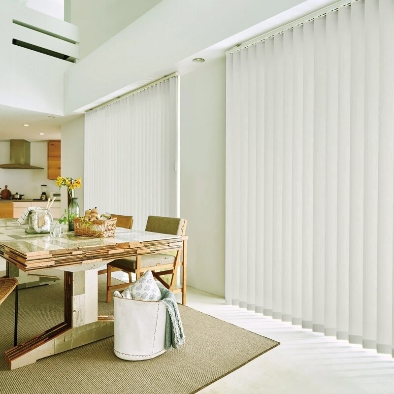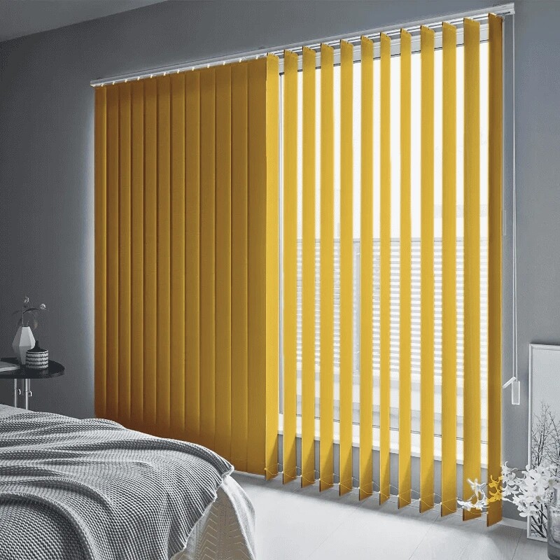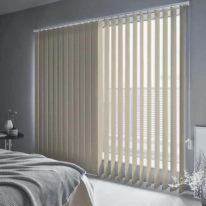 スタイリッシュな空間を実現するバーチカルブラインド(縦型ブラインド)。ストライプの美しい光を窓辺に映します。外からの視線や光を遮るので、プライベートルームや寝室などに最適なバーチカルブラインドで、上質でシックなテイストの生地です。