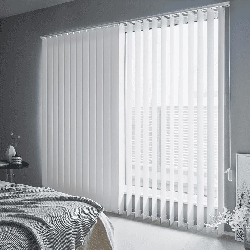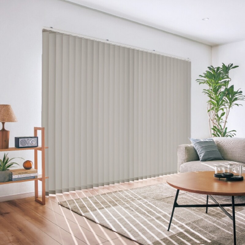 スタイリッシュな空間を実現するバーチカルブラインド(縦型ブラインド)。ストライプの美しい光を窓辺に映します。外からの視線や光を遮るので、プライベートルームや寝室などに最適なバーチカルブラインドで、上質でシックなテイストの生地です。