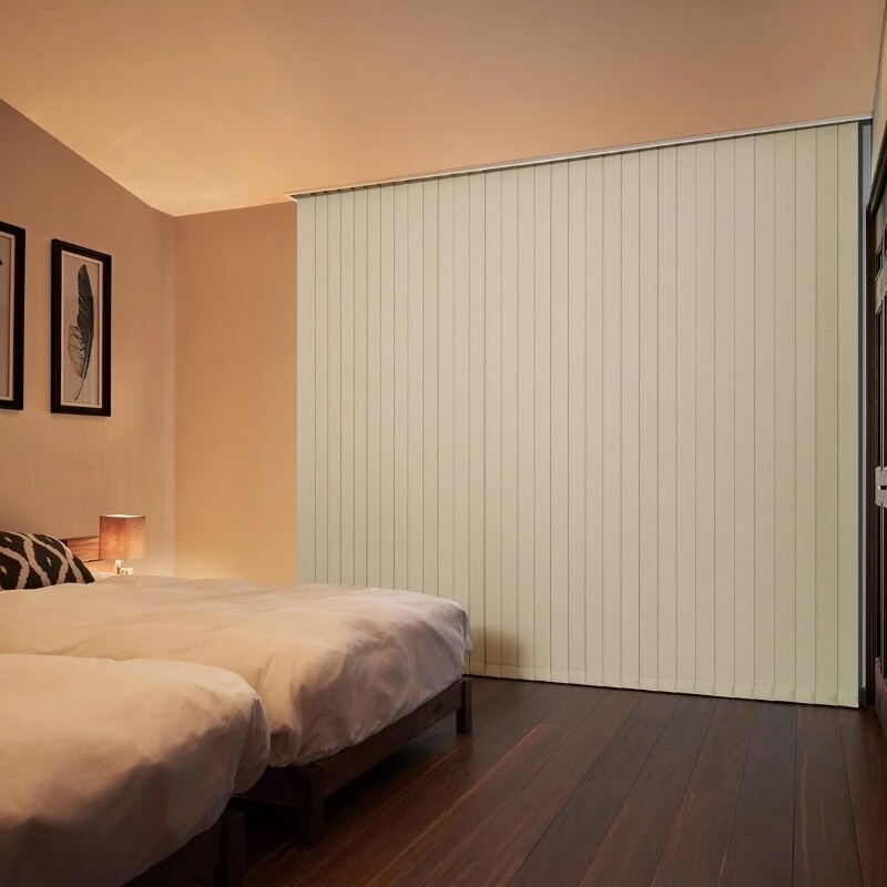 スタイリッシュな空間を実現するバーチカルブラインド(縦型ブラインド)。ストライプの美しい光を窓辺に映します。外からの視線や光を遮るので、プライベートルームや寝室などに最適なバーチカルブラインドで、定番のカジュアルテイストな生地です。