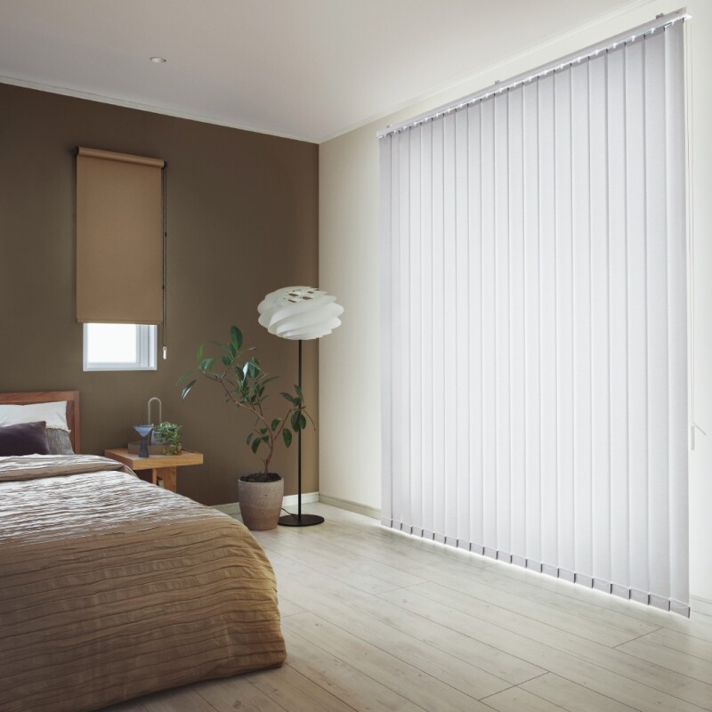 スタイリッシュな空間を実現するバーチカルブラインド(縦型ブラインド)。ストライプの美しい光を窓辺に映します。外からの視線や光を遮るので、プライベートルームや寝室などに最適なバーチカルブラインドで、定番のカジュアルテイストな生地です。