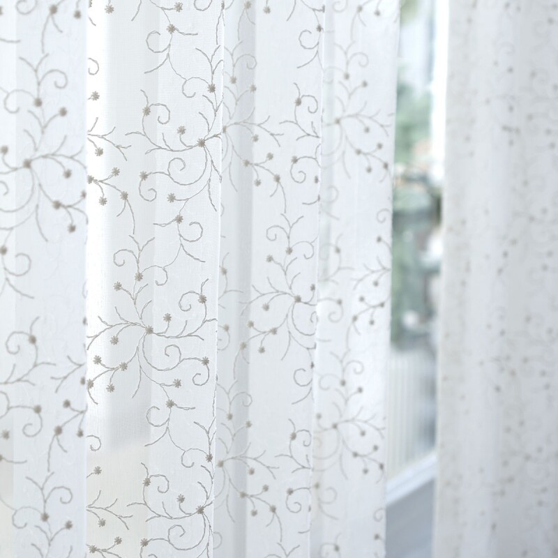 ナチュラルな風合いのスパンボイルのベース生地に、細やかな蔓(つる)の曲線と可憐な小花が連なる、伝統的なボタニカルモチーフの刺繍レースです。クラシカルでどこかアンティークの趣を感じさせ、スカラップ仕立ての裾が華やぎをプラスします。家庭洗濯OK(ウォッシャブル)なので、お手入れも簡単。カラー:ニュートラルなグレー色