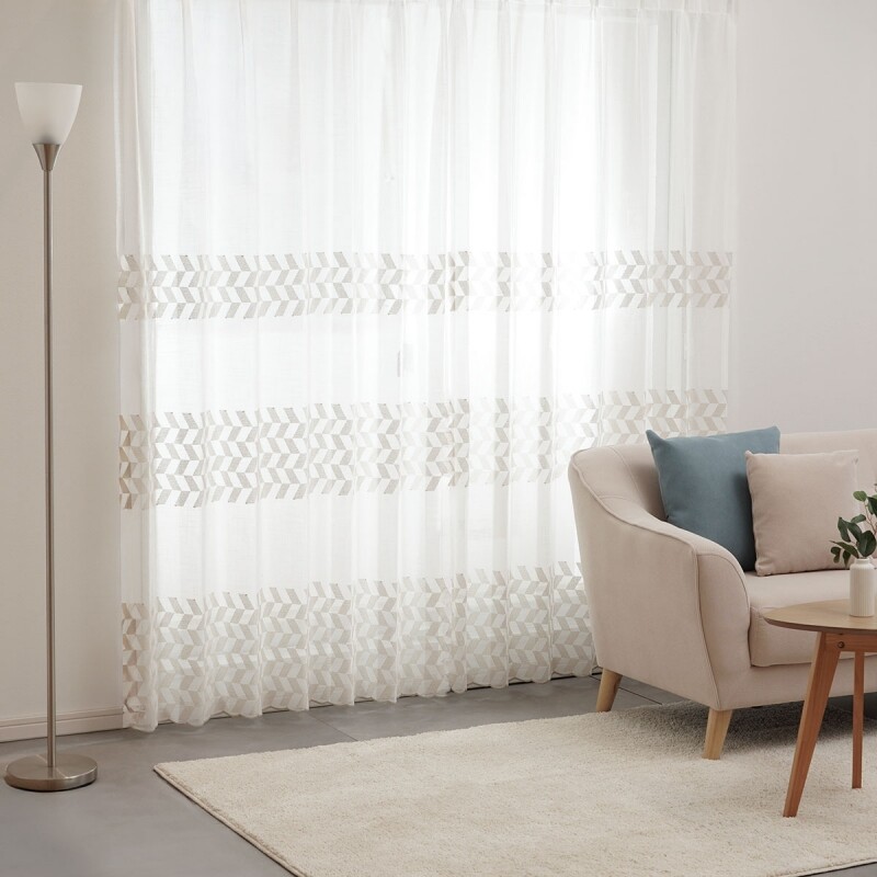 ホワイト色の刺繍糸で斜めのブロック模様を連ねた、ジオメトリックデザインの裾スカラップレースです。糸の太細がはっきりとした天然素材のようなテクスチャーのベース生地は透け感があり、刺繍との美しいコントラストが魅力。シンプルで都会的なデザインは、空間を洗練された表情に導きます。家庭洗濯OK(ウォッシャブル)なので、お手入れも簡単。カラー:ナチュラルなホワイト色