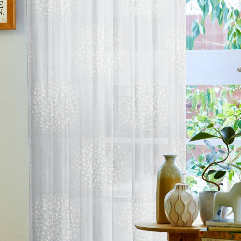 光のきらめきにも、雪の結晶にも、タンポポの綿毛にも見える小さなモチーフが集まり大きなサークルを形作った、北欧テイストのナチュラル&モダンなプリントレースです。プリントには顔料インクを使っているので、しっかりと柄が生地に乗っています。家庭洗濯OK(ウォッシャブル)なのでお手入れも簡単。カラー:白っぽいゴールド色